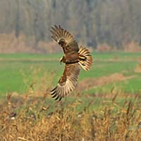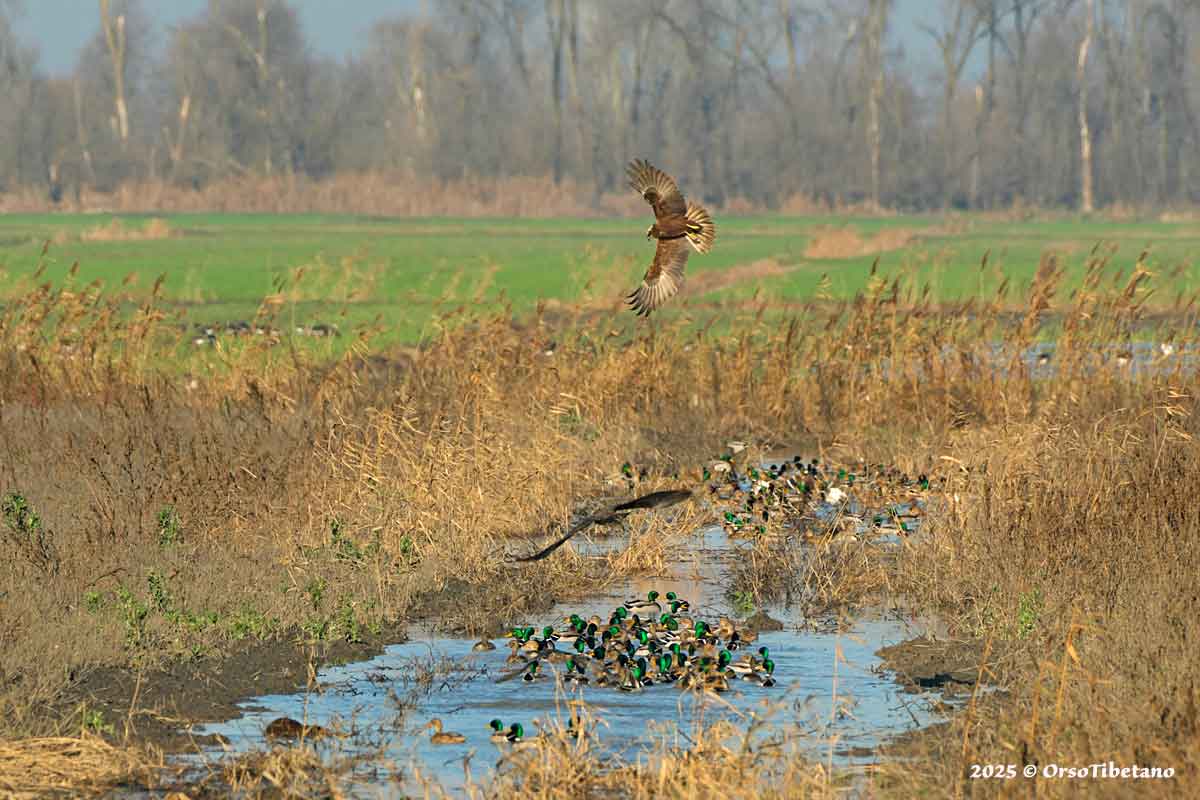 Falchi di palude (Circus aeruginosus) in volo sopra un gruppo di Germani reali (Anas platyrhychos), sullo sfondo si intravedono Oche seltatiche (Anser anser) o Oche Lombardelle (Anser albifrons) |